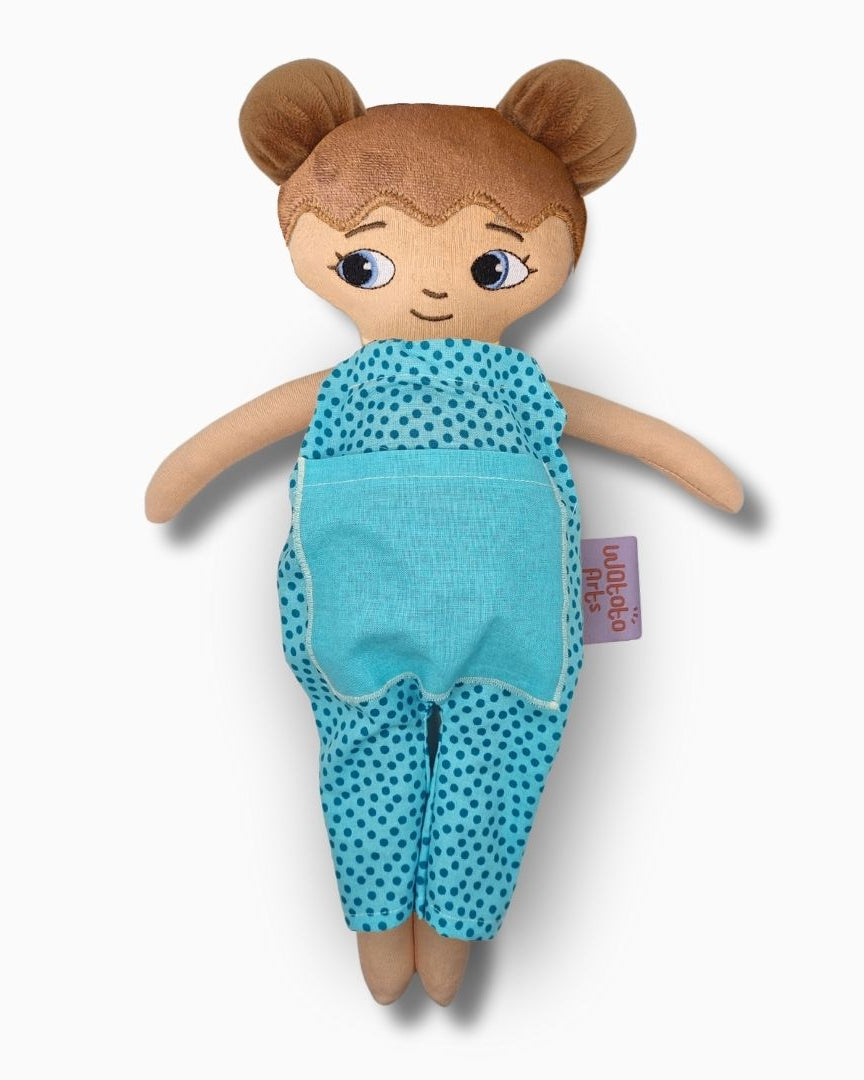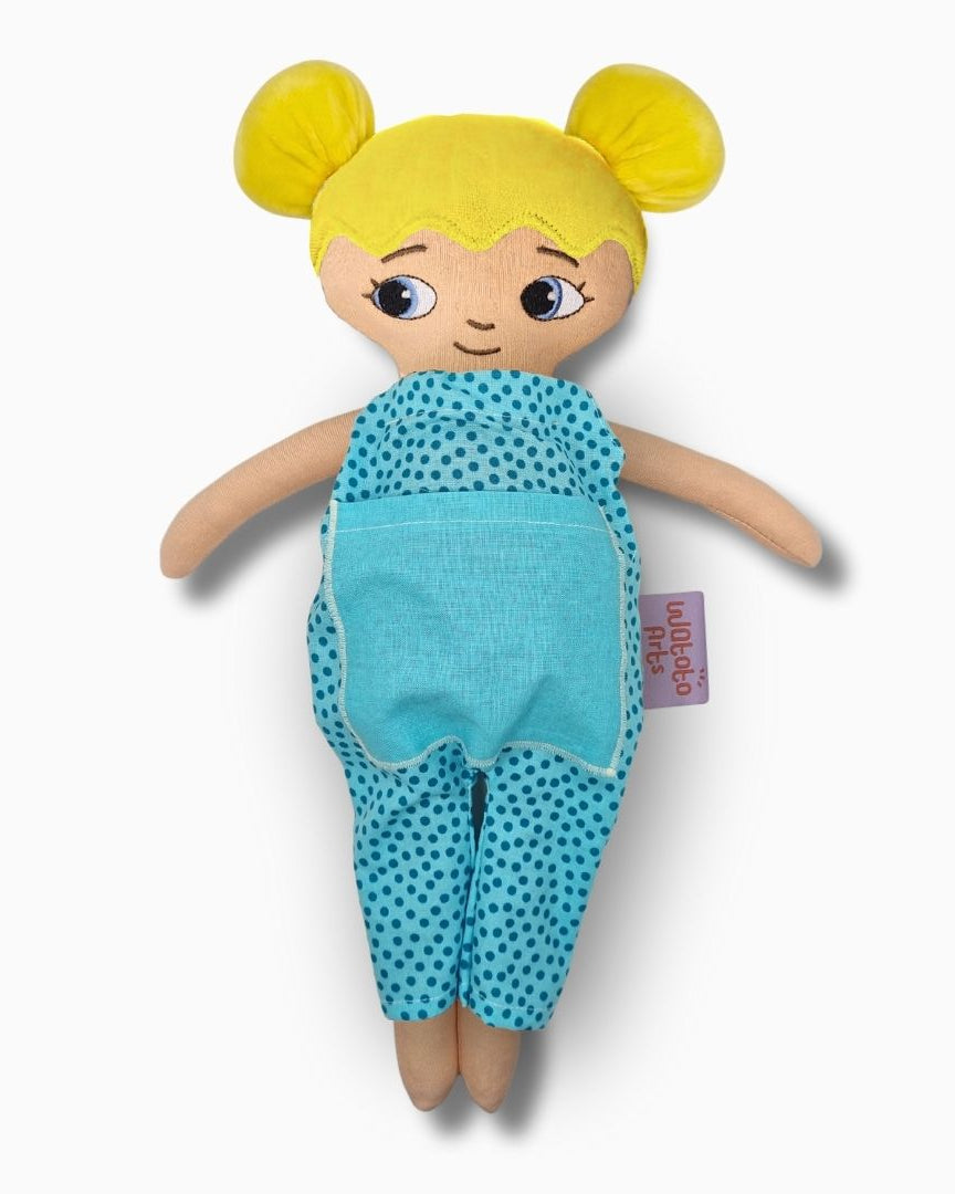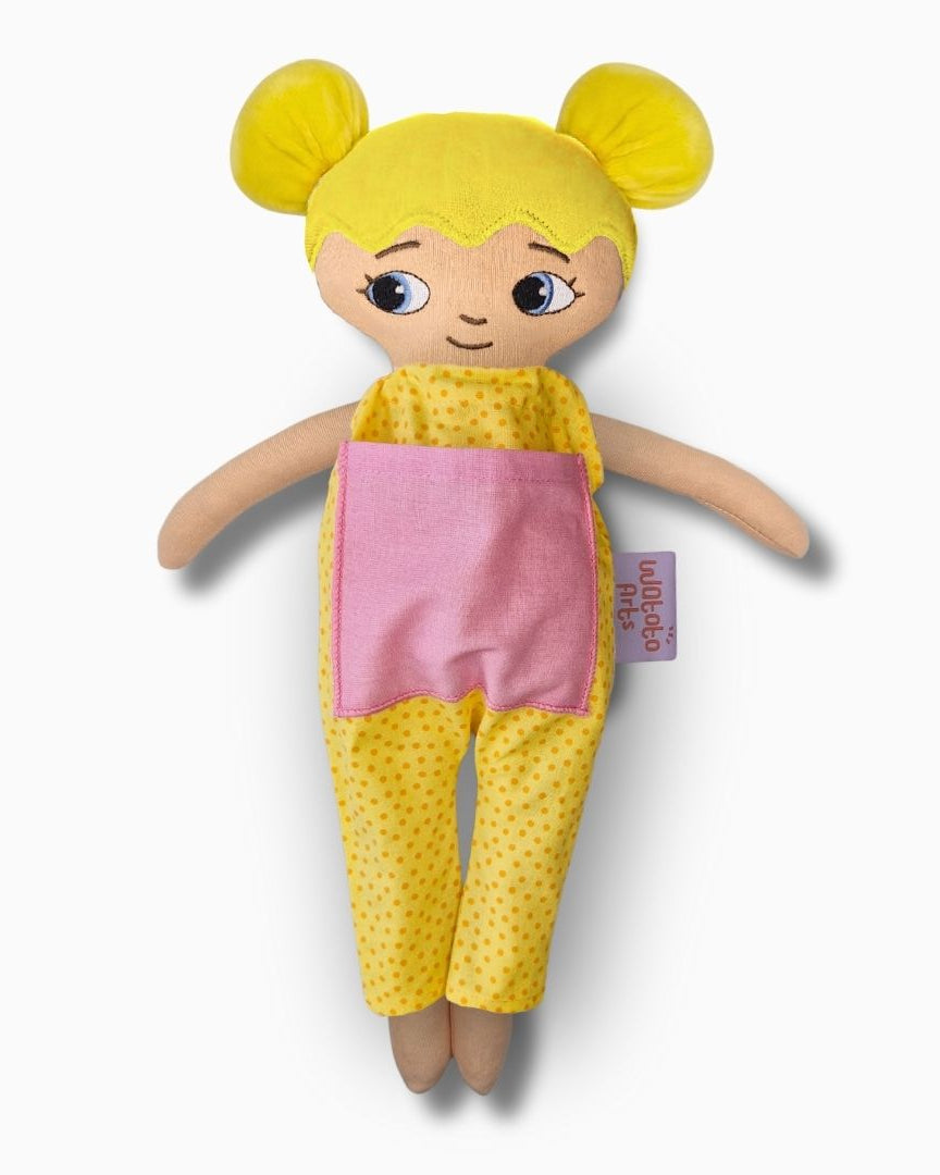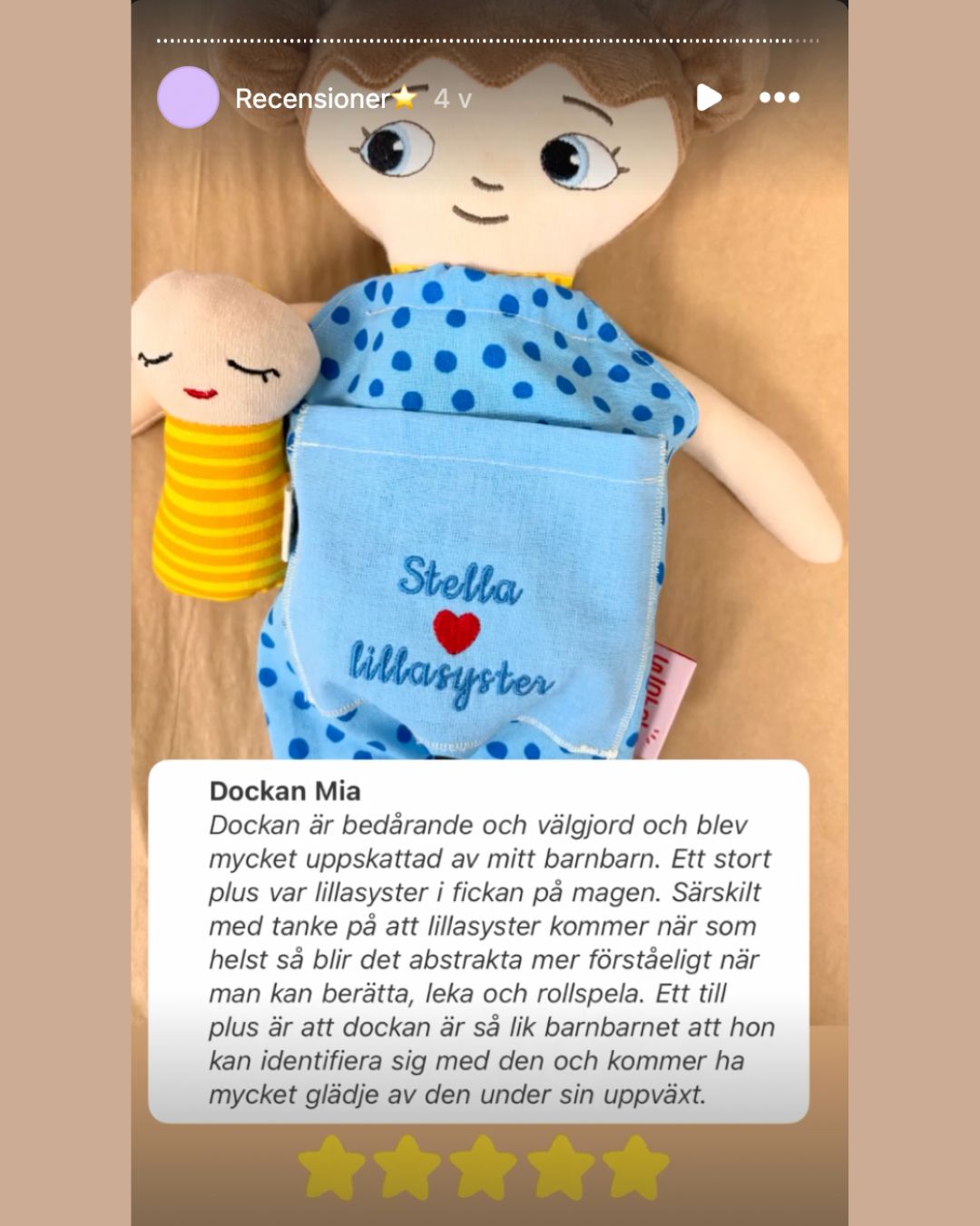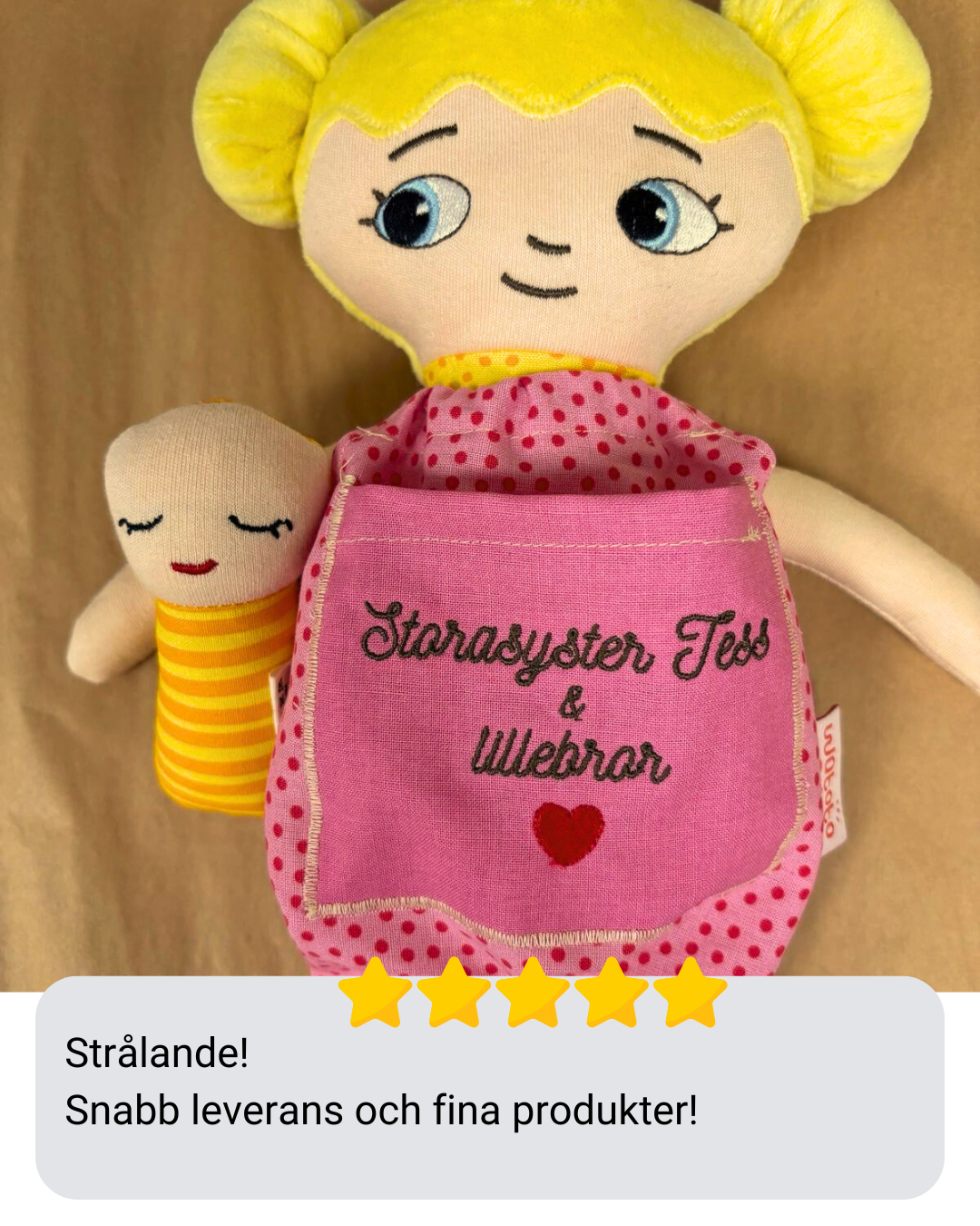 Dockan är bedårande och välgjord och blev mycket uppskattad av mitt barnbarn. Ett stort plus var lillasyster i fickan på magen. Särskilt med tanke på att lillasyster kommer när som helst så blir det abstrakta mer förståeligt när man kan berätta, leka och rollspela. Ett till plus är att dockan är så lik barnbarnet att hon kan identifiera sig med den och kommer ha mycket glädje av den under sin uppväxt.