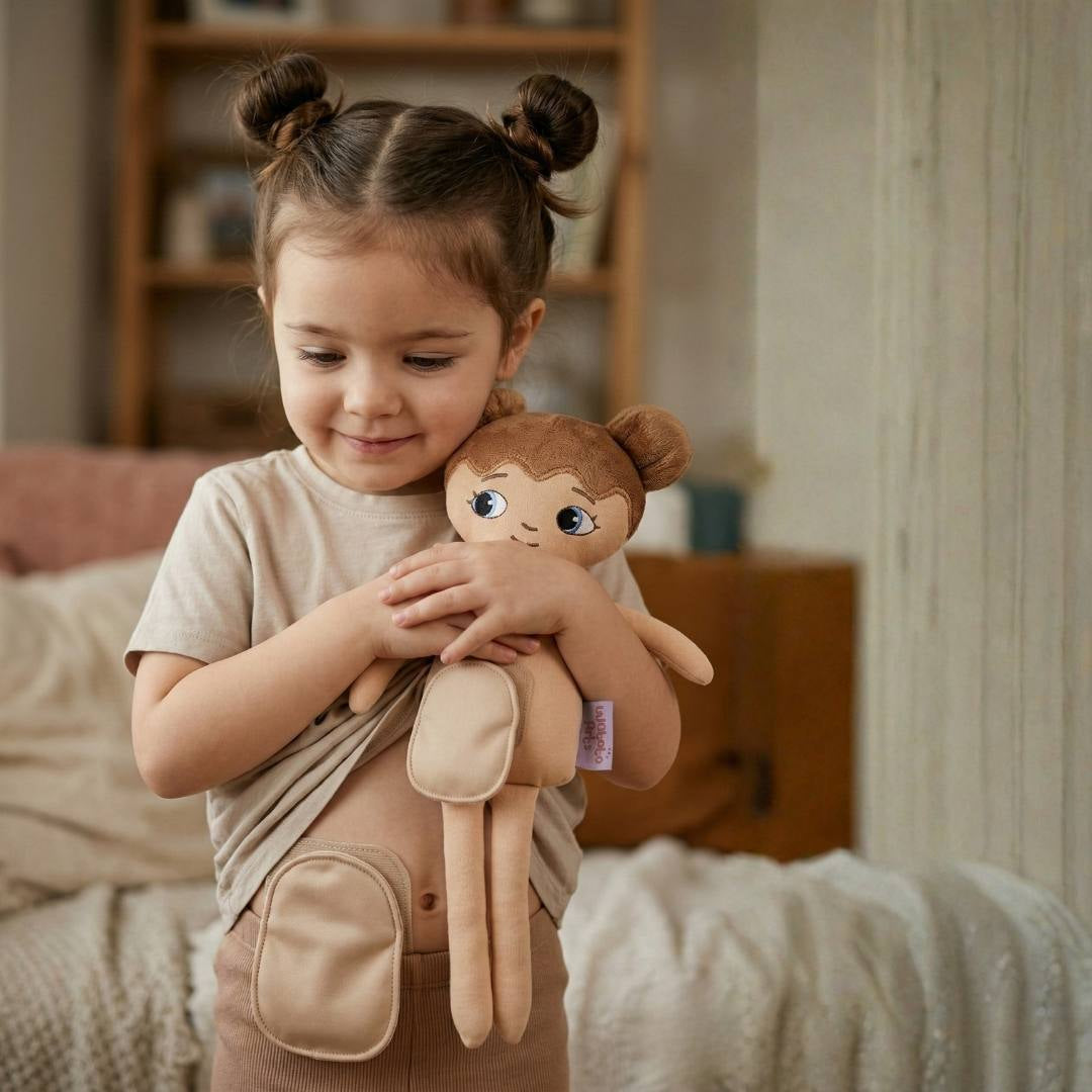 Denna mjuka och kramvänliga docka är varsamt handgjord i Sverige av ekologiska och giftfria tyger. Dockan är utrustad med en avtagbar stomipåse som fästs med kardborre, vilket gör den till ett värdefullt verktyg för barn att förstå och normalisera användningen av stomipåsar. (Kläder ingår!)