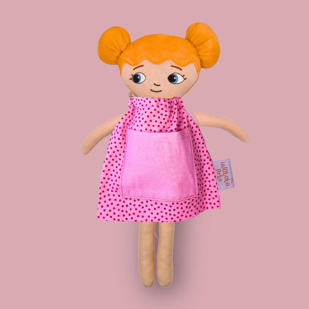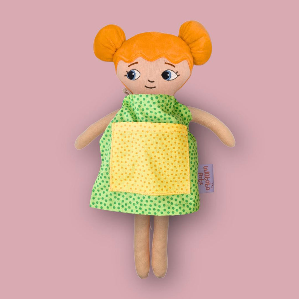 Hos Watoto Arts har du möjligheten att personligen välja om du vill fylla din docka med fårull eller med återvunnen polyester. Båda materialen har fina egenskaper.