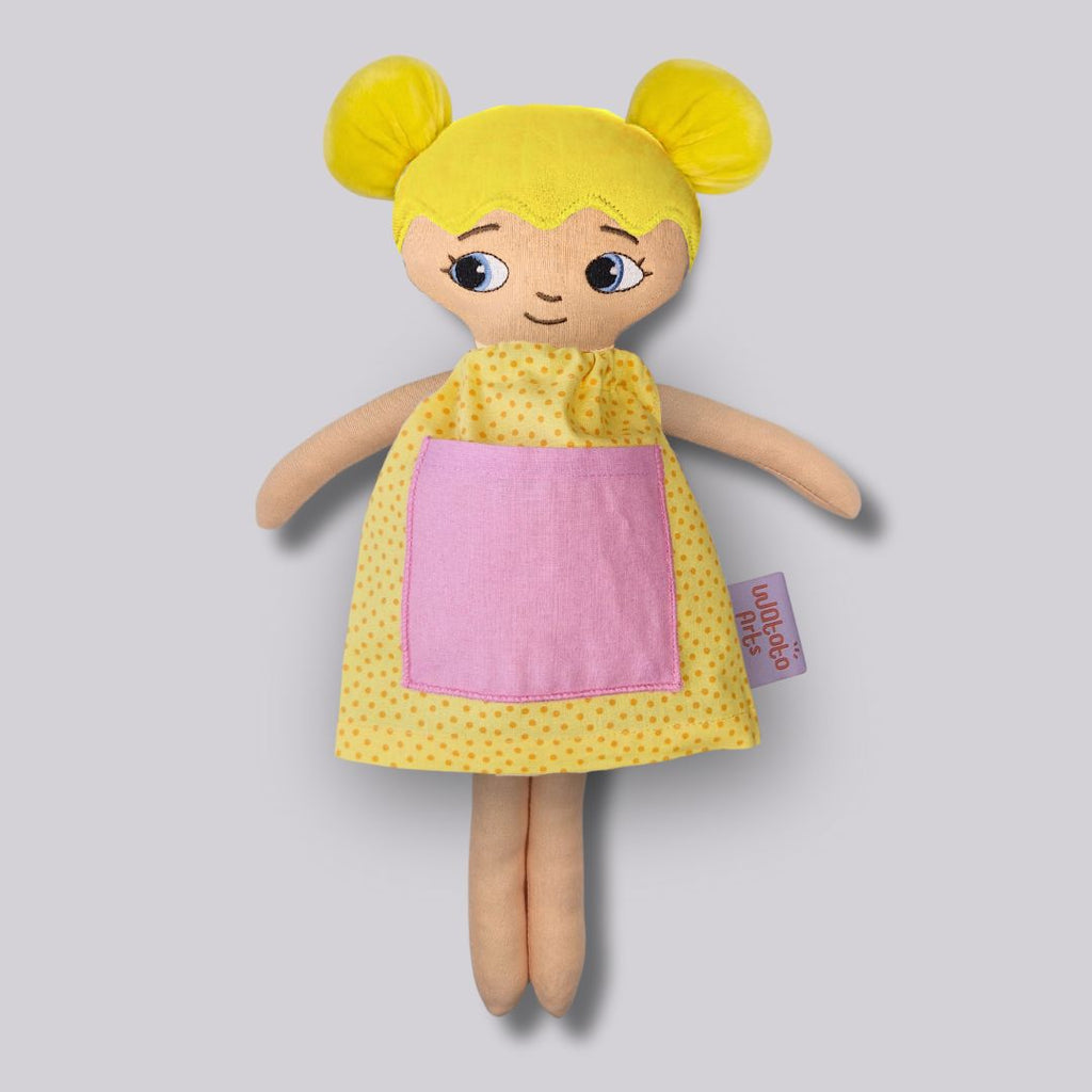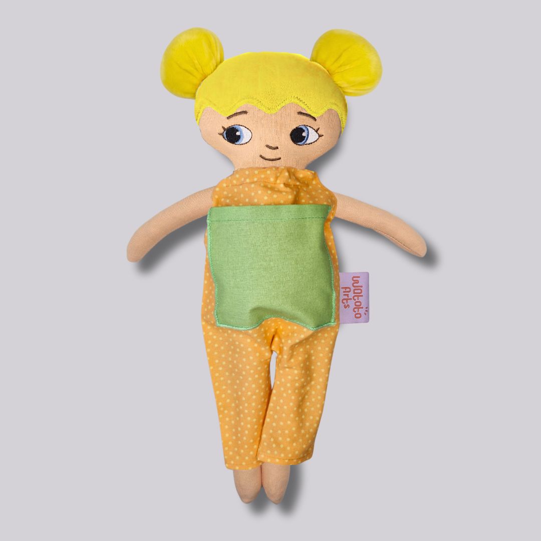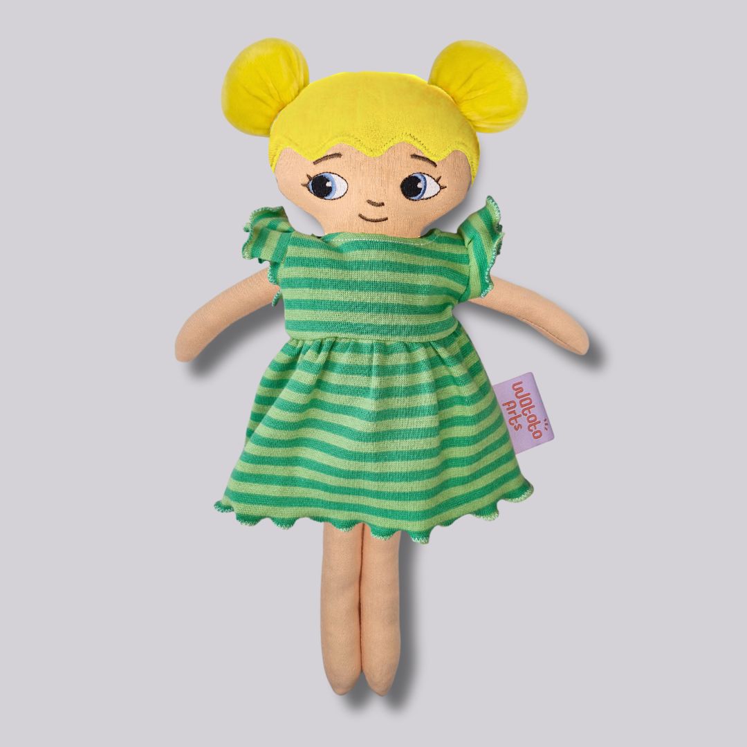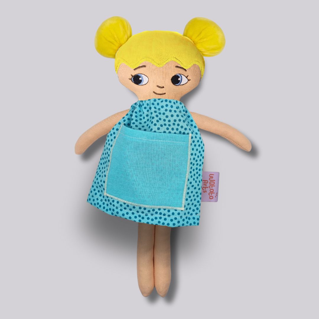 Alyssa är en mjuk, kramvänlig docka, varsamt tillverkad i Sverige av ekologiska och giftfria tyger. Med sitt varma och snälla uttryck, blir dockan snabbt en trygg och älskad vän för barnet. Alyssa har blont hår och blå ögon. Hon har på sig en avtagbar dräkt med en liten ficka – perfekt för att bära med sig en bebisdocka på äventyr. Vilka kläder vill du att Alyssa ska bära? du väljer själv!