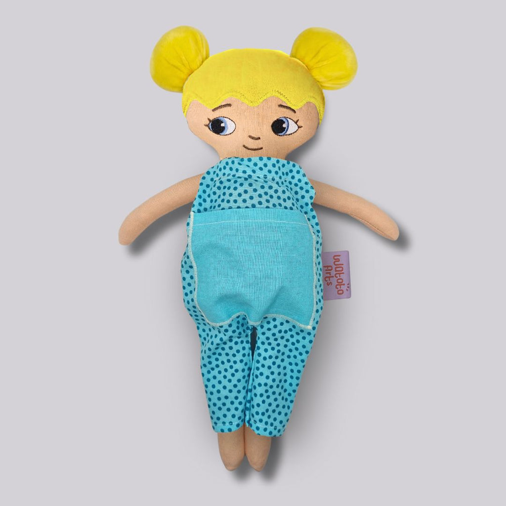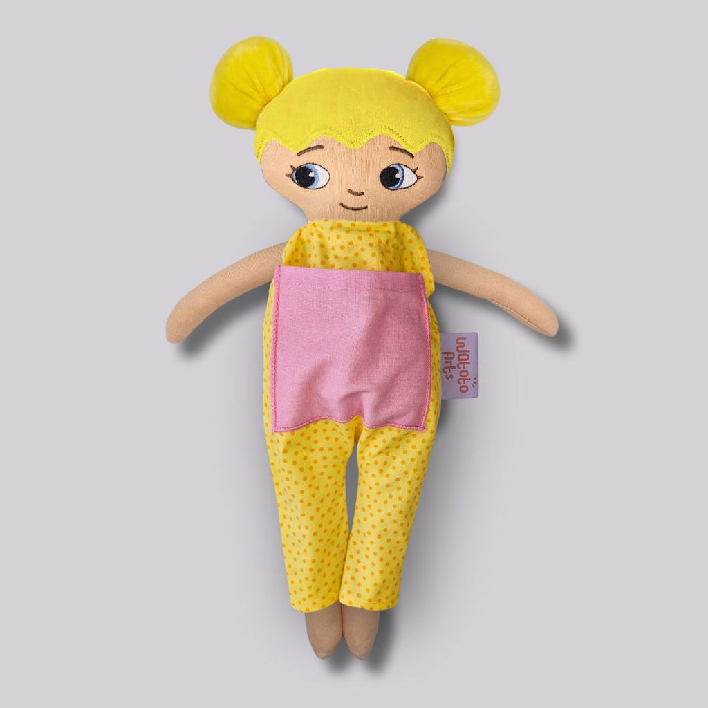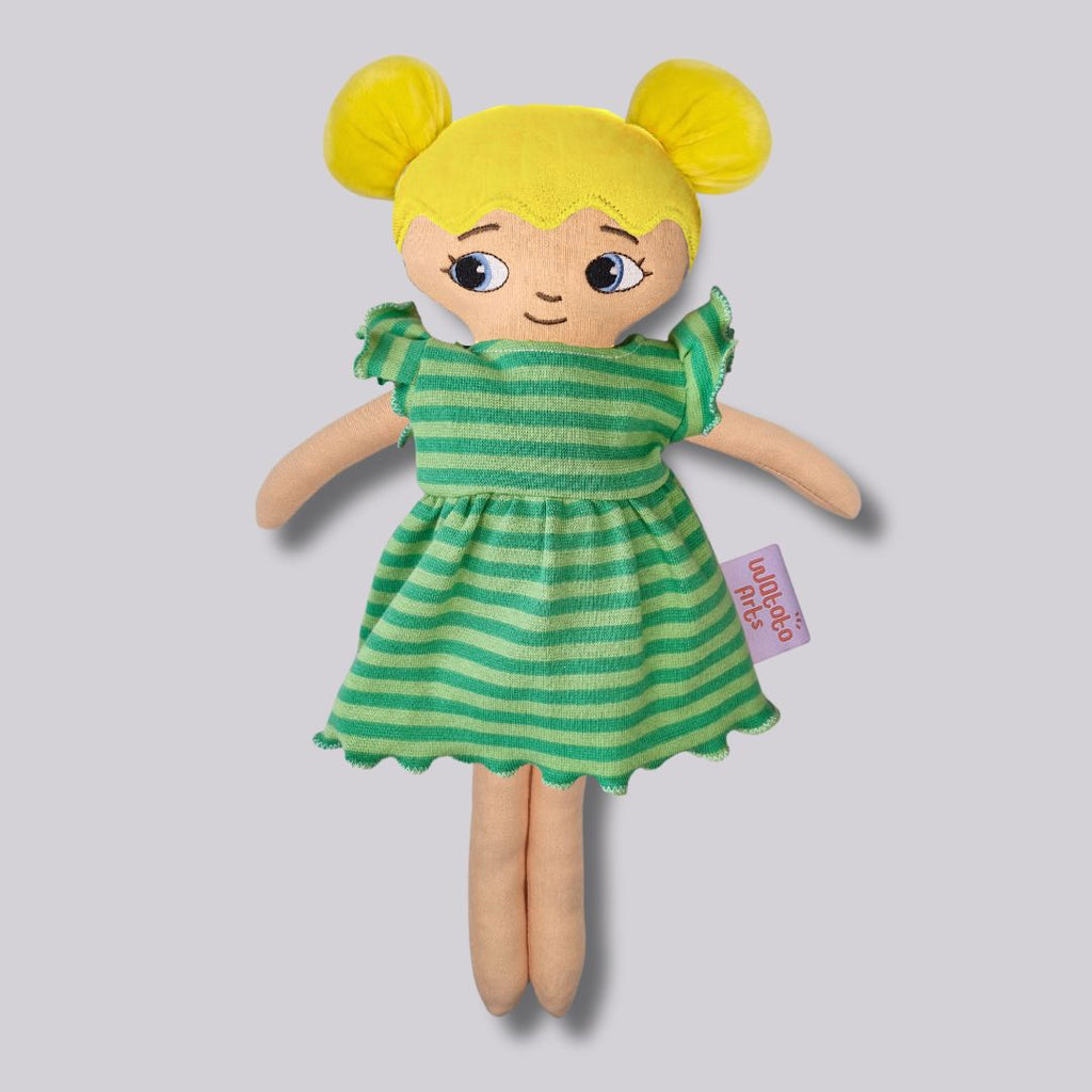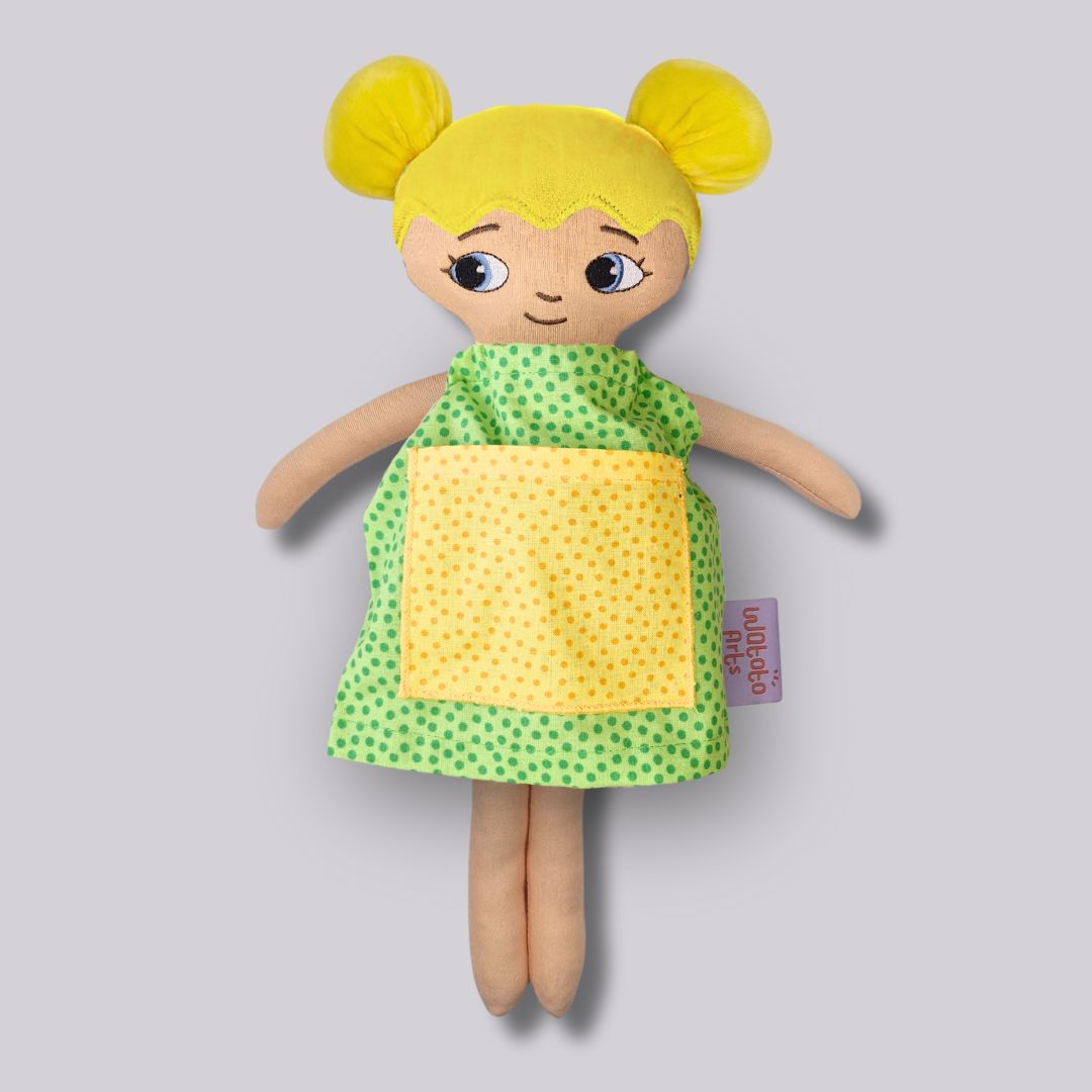 Alyssa är en mjuk, kramvänlig docka, varsamt tillverkad i Sverige av ekologiska och giftfria tyger. Med sitt varma och snälla uttryck, blir dockan snabbt en trygg och älskad vän för barnet. Alyssa har blont hår och blå ögon. Hon har på sig en avtagbar dräkt med en liten ficka – perfekt för att bära med sig en bebisdocka på äventyr. Vilka kläder vill du att Alyssa ska bära? du väljer själv!