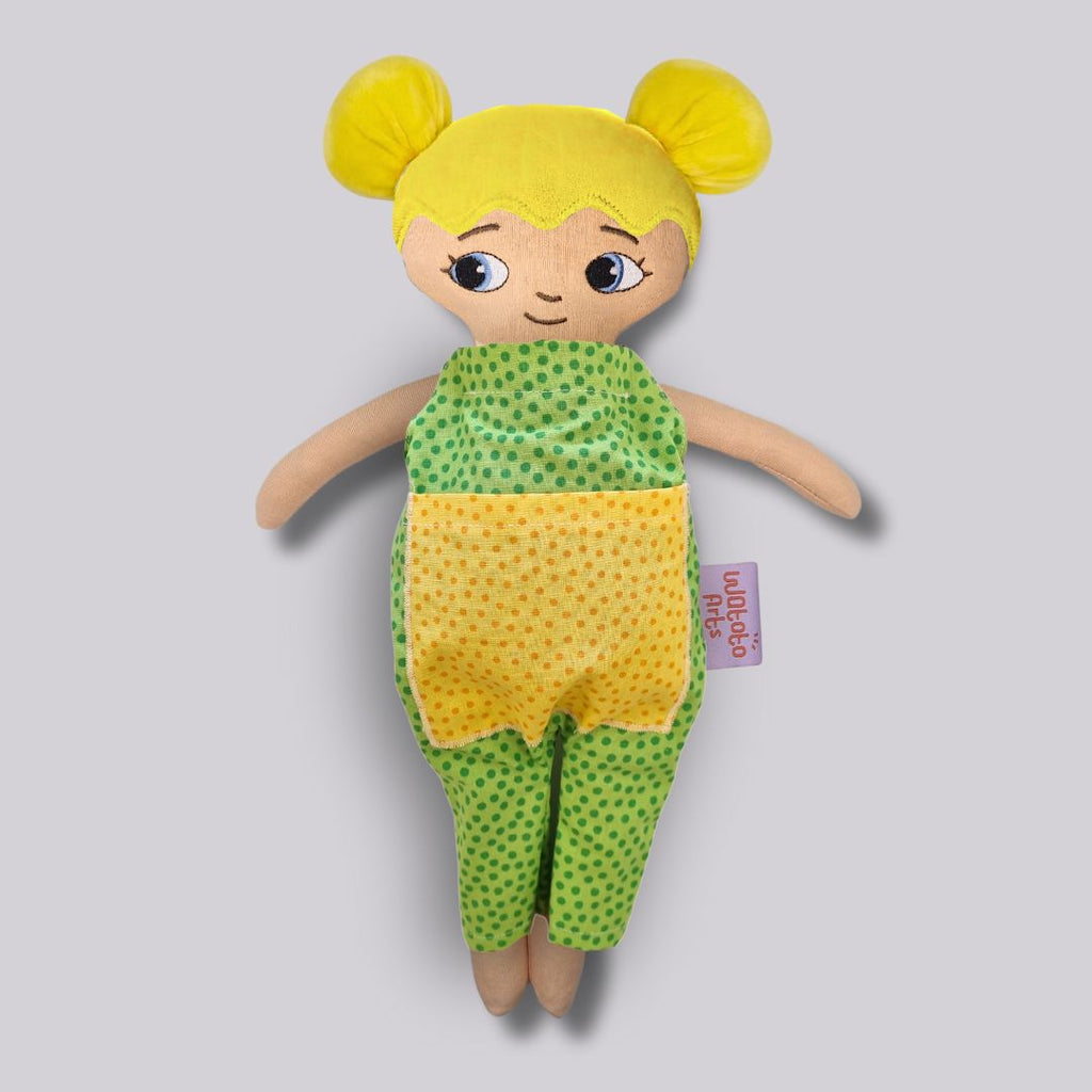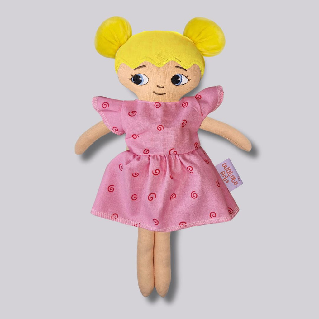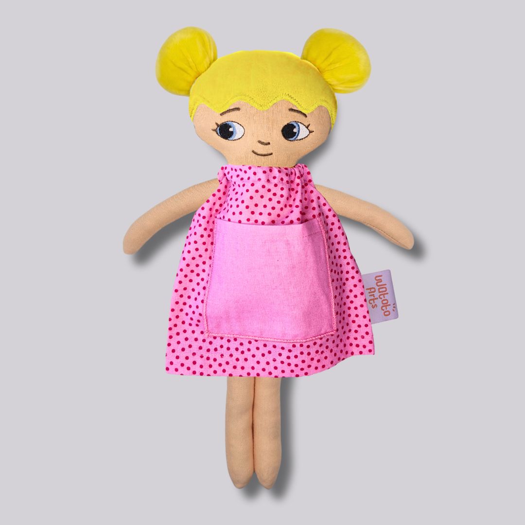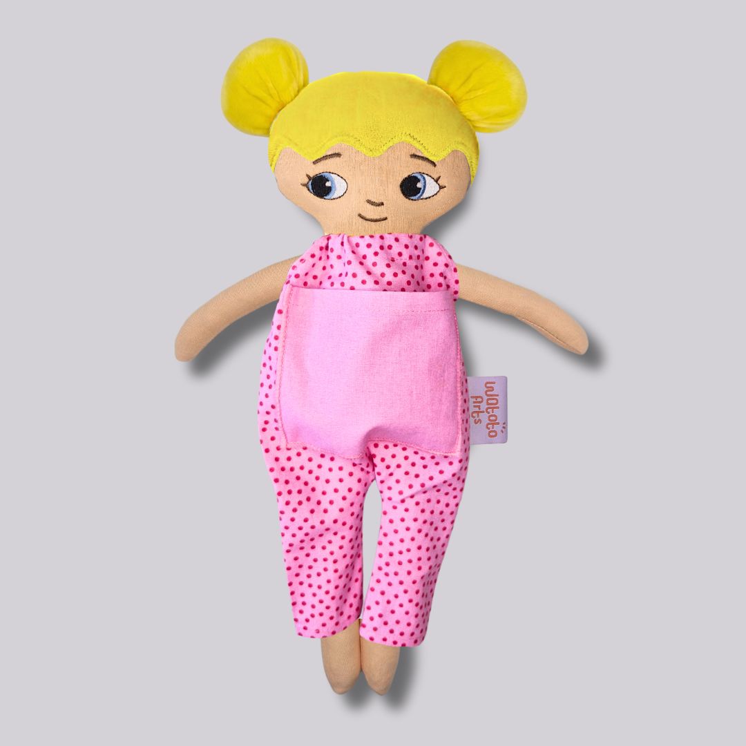 Alyssa är en mjuk, kramvänlig docka, varsamt tillverkad i Sverige av ekologiska och giftfria tyger. Med sitt varma och snälla uttryck, blir dockan snabbt en trygg och älskad vän för barnet. Alyssa har blont hår och blå ögon. Hon har på sig en avtagbar dräkt med en liten ficka – perfekt för att bära med sig en bebisdocka på äventyr. Vilka kläder vill du att Alyssa ska bära? du väljer själv!